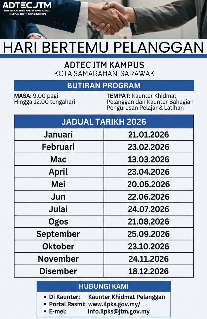 ADTEC JTM Kampus Kota Samarahan akan menganjurkan Hari Bertemu Pelanggan sepanjang tahun 2026 sebagai platform